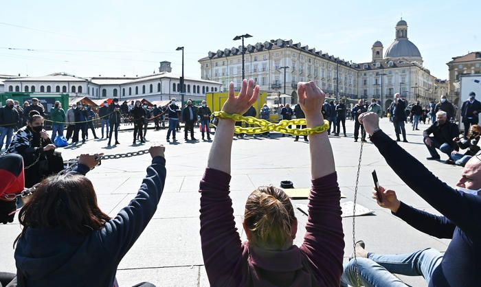 Mercatali, ambulanti e battitori alzano le catene dai polsi fino all'altezza del collo simulando un'impiccagione