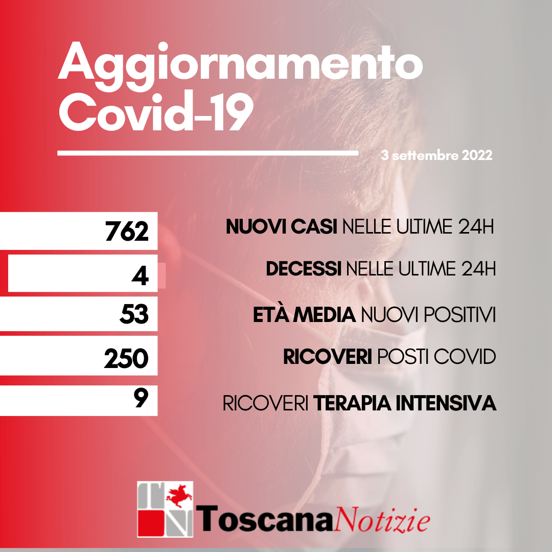 Sono 4 i morti di coronavirus, in Toscana, oggi 3 settembre 2022. Si tratta di tre uomini e una donna con età media di 83 anni. Sono 762 i nuovi casi d Covid-19 registrati nelle...