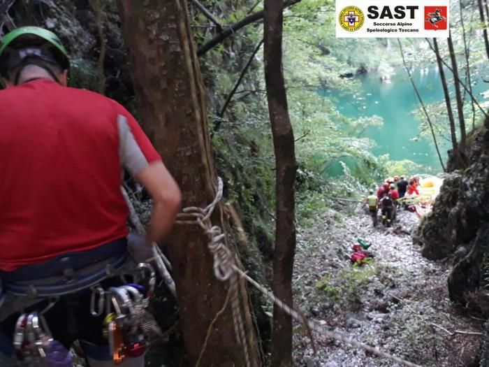 È stata effettuata una calata di 15 metri nella vegetazione fino alla sponda del lago dove, tramite il gommone dei Vvf è stata trasportata sull'altra sponda del lago e qui...