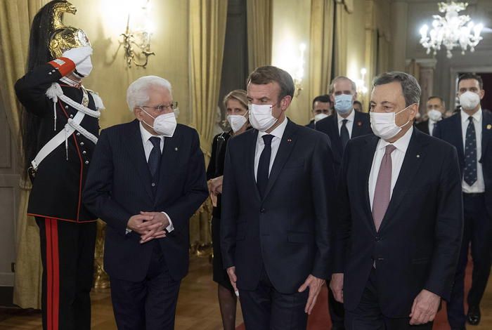 Subito dopo la firma del Trattato del Quirinale mentre il capo dello Stato Sergio Mattarella, il presidente francese Emmanuel Macron e il premier Mario Draghi ascoltavano i...