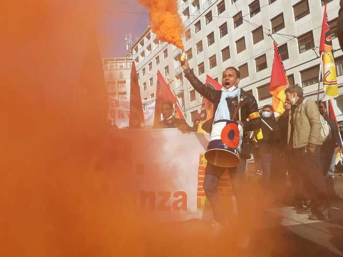Mentre Draghi abbraccia per tre volte Landini, altri sindacati non omologati, i Cub, sono scesi in piazza per protestare contro la politica dell'ex Presidente della Bce
