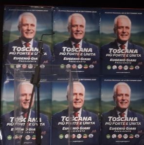 Sono stati allestiti anche manifesti elettorali di Eugenio Giani come drop perche' siano visibili alle spalle del candidato alla presidenza di regione per il centro sinistra...