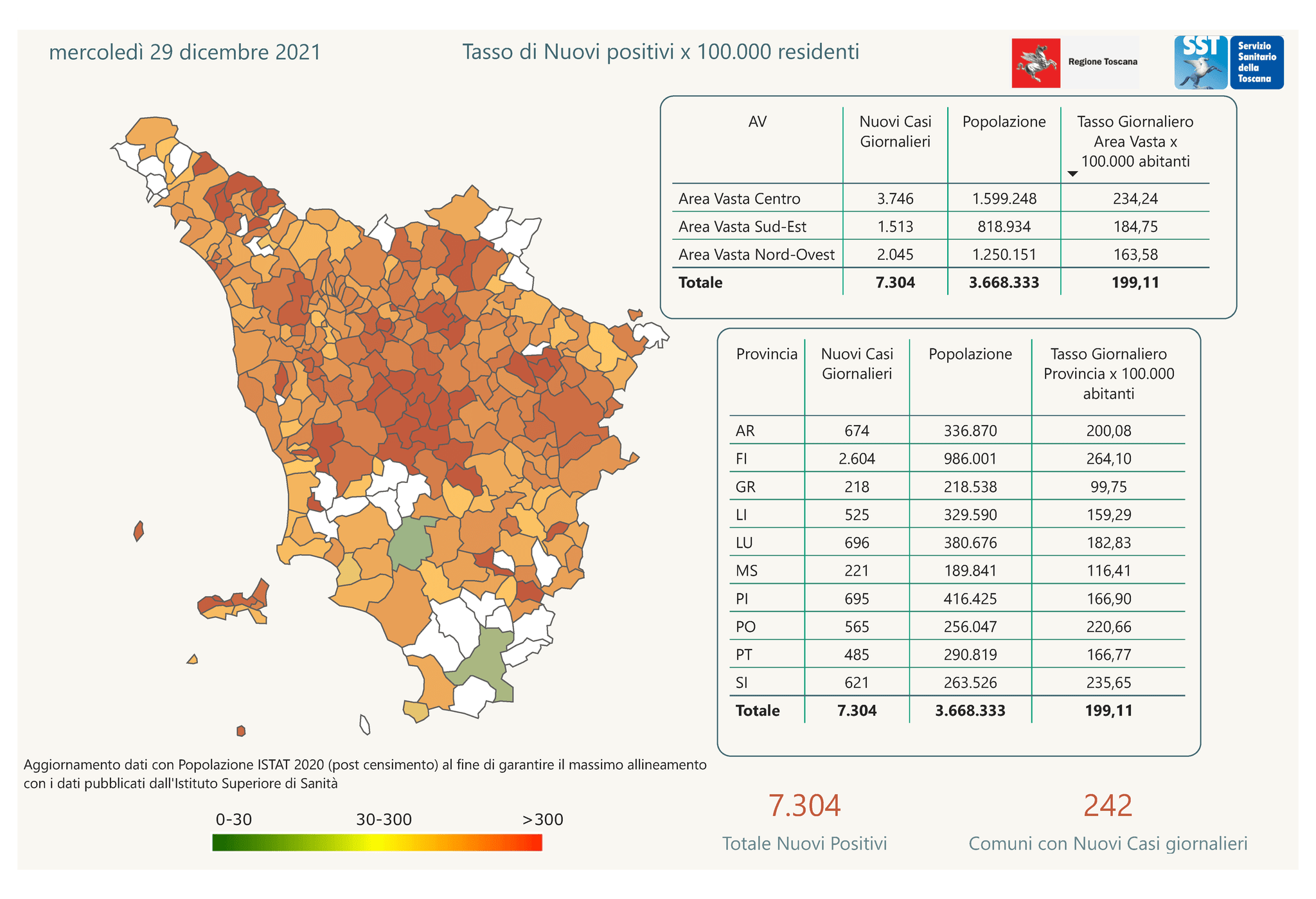 Nuovo allarmante record di contagi di Covid-19 in Toscana, oggi 29 dicembre 2021. I nuovi positivi sono 7.304 su 56.064 test di cui 24.034 tamponi molecolari e 32.030 test...