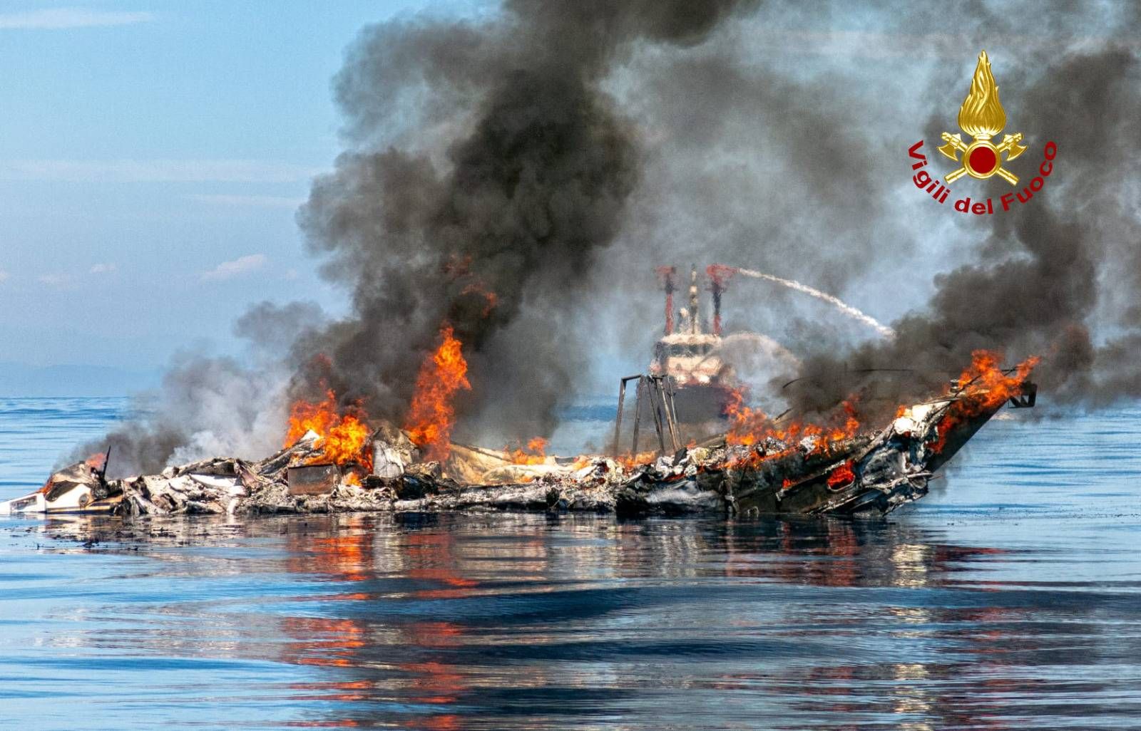 Incendio a bordo di una barca di 13 metri stamani, 10 agosto 2023, a largo della Gorgona. Salvate nove persone, tra cui tre bambini