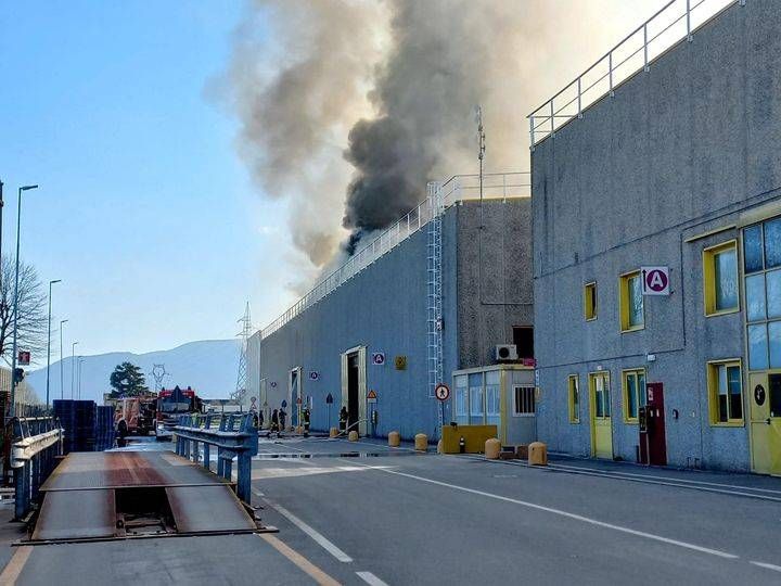 Un vasto incendio nella cartiera Essity di Porcari e' scoppiato questo pomeriggio, 12 marzo 2023. Le fiamme, divampate per cause ancora in via di accertamento, stanno...