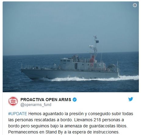 Ore di tensione nel mediterraneo a 73 miglia dalle coste libiche fra una nave della Ong Proactiva Open Arms e una motovedetta libica