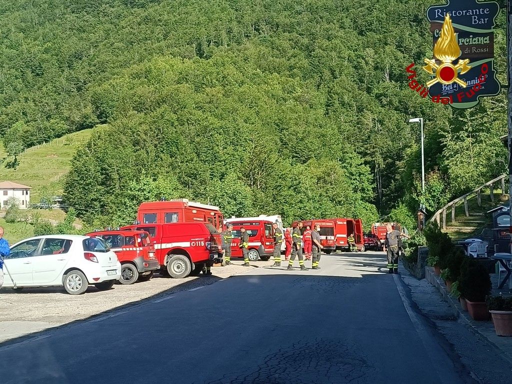 Le operazioni proseguono, e in esse sono impiegati, tra l'altro, un elicottero di Bologna, droni, squadre a terra, esperti in topografia, cinofili e personale speleo alpino...