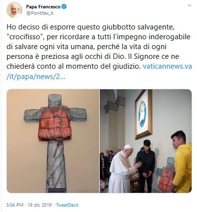 Una croce e un giubbotto salvagente. Sono questi simboli di sofferenza, esposti in Vaticano nel Cortile del Belvedere, al centro del discorso rivolto da Papa Francesco ai...