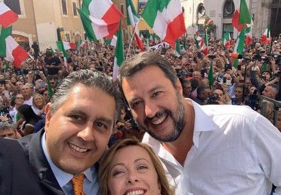 Nessun simbolo di partito ma solo bandiere con il tricolore riprodotto anche sui palloncini che spiccano in alto ai lati del palco. Insieme alle bandiere compaiono anche due...