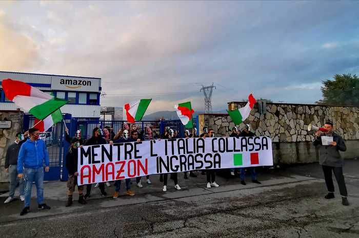 Protesta contro Amazon organizzata dal movimento delle Mascherine tricolori a Calenzano (Firenze) davanti a un centro di smistamento del colosso dell'e-commerce
