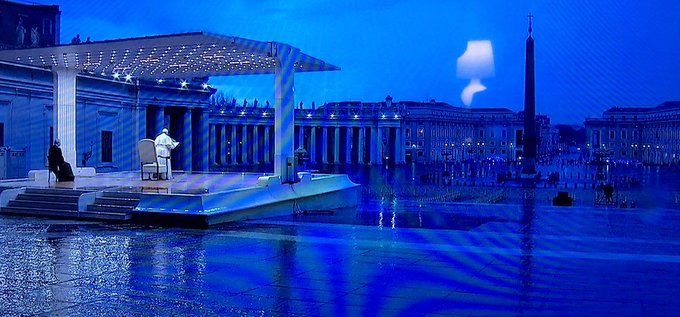 Papa Francesco prega in una Piazza San Pietro deserta e battuta dalla pioggia