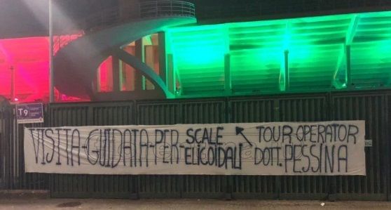 Lo striscione, senza firma, recita: «Visita guidata per scale elicoidali, tour operator Dott. Pessina»