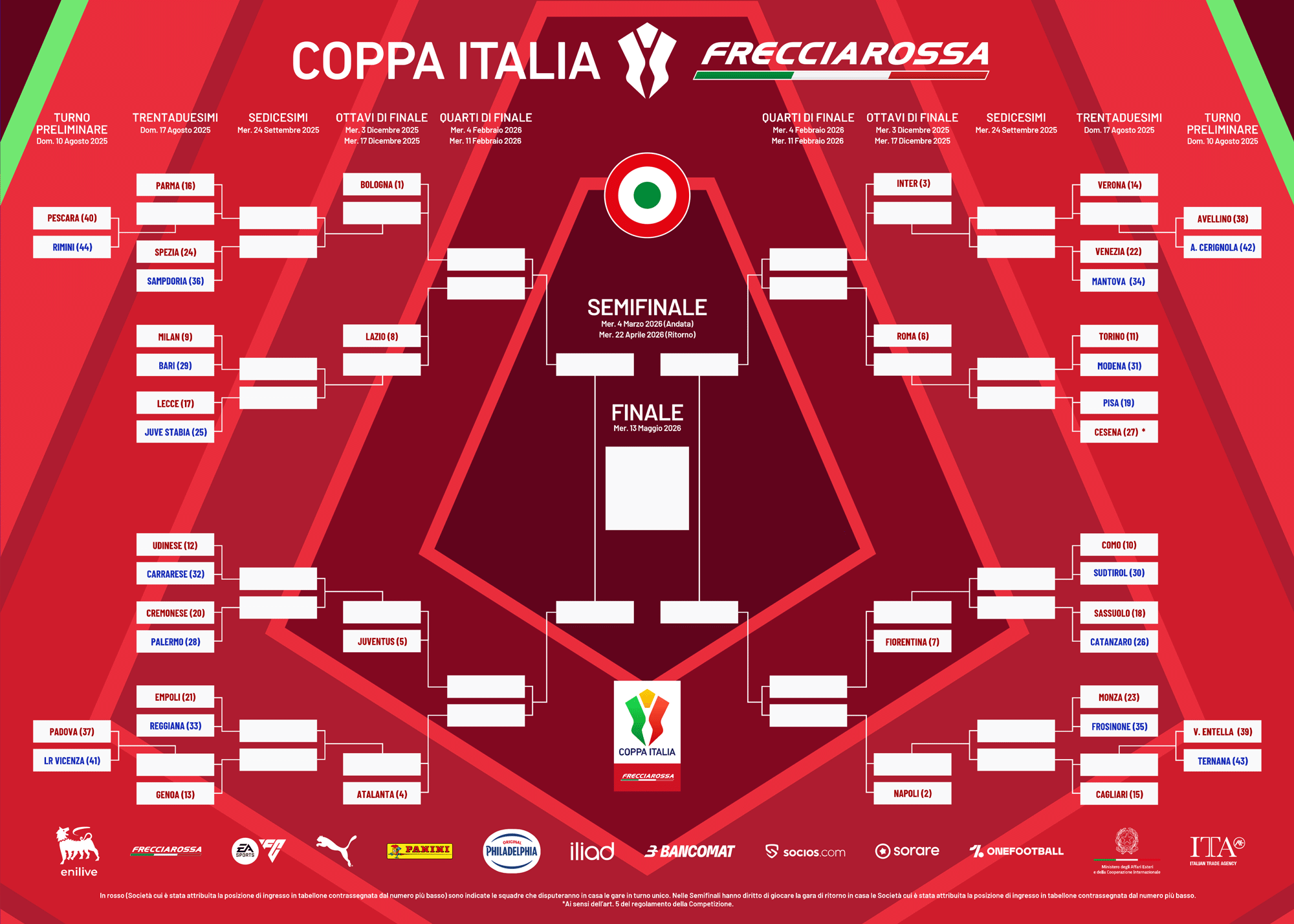 Tabellone Coppa Italia 2025-26MILANO – Definito il tabellone per l’edizione 2025/26 della CoppaItalia: determinante, nella compilazione, la classifica...