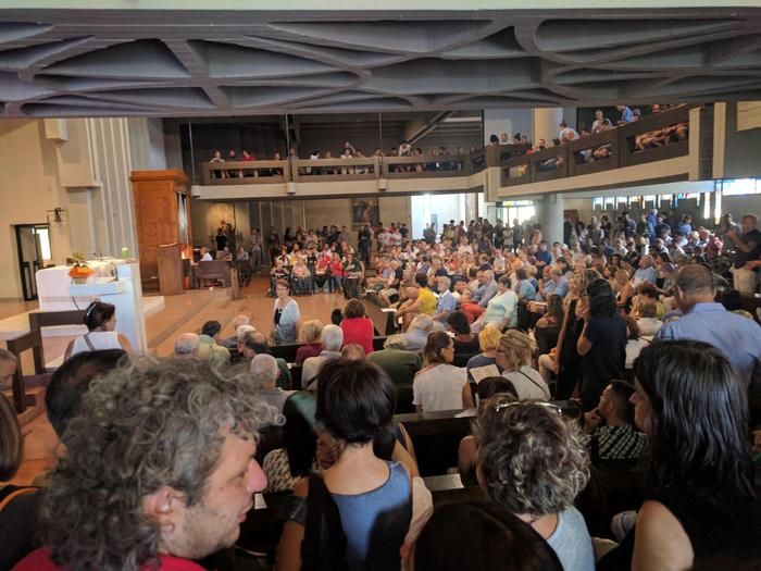 Chiesa gremita di fedeli, di militanti di FN e di migranti. Forze dell'ordine e vigili urbani sono schierati per prevenire incidenti, molte anche le telecamere e i...