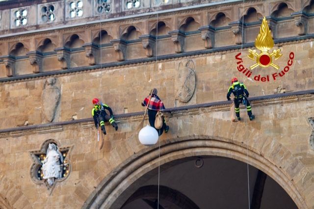 I Vigili del Fuoco del Comando di Firenze sono intervenuti in Piazza della Signoria per un soccorso a persona. L'artista ceco PISVEJC Vaclav in piedi sulla balaustra della...