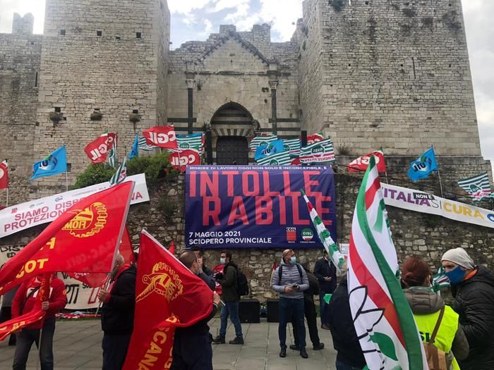 Sul Castello dell'Imperatore, che domina piazza Santa Maria delle Carceri, sede del presidio, svetta uno striscione con la scritta 'Morire di lavoro oggi non solo è...