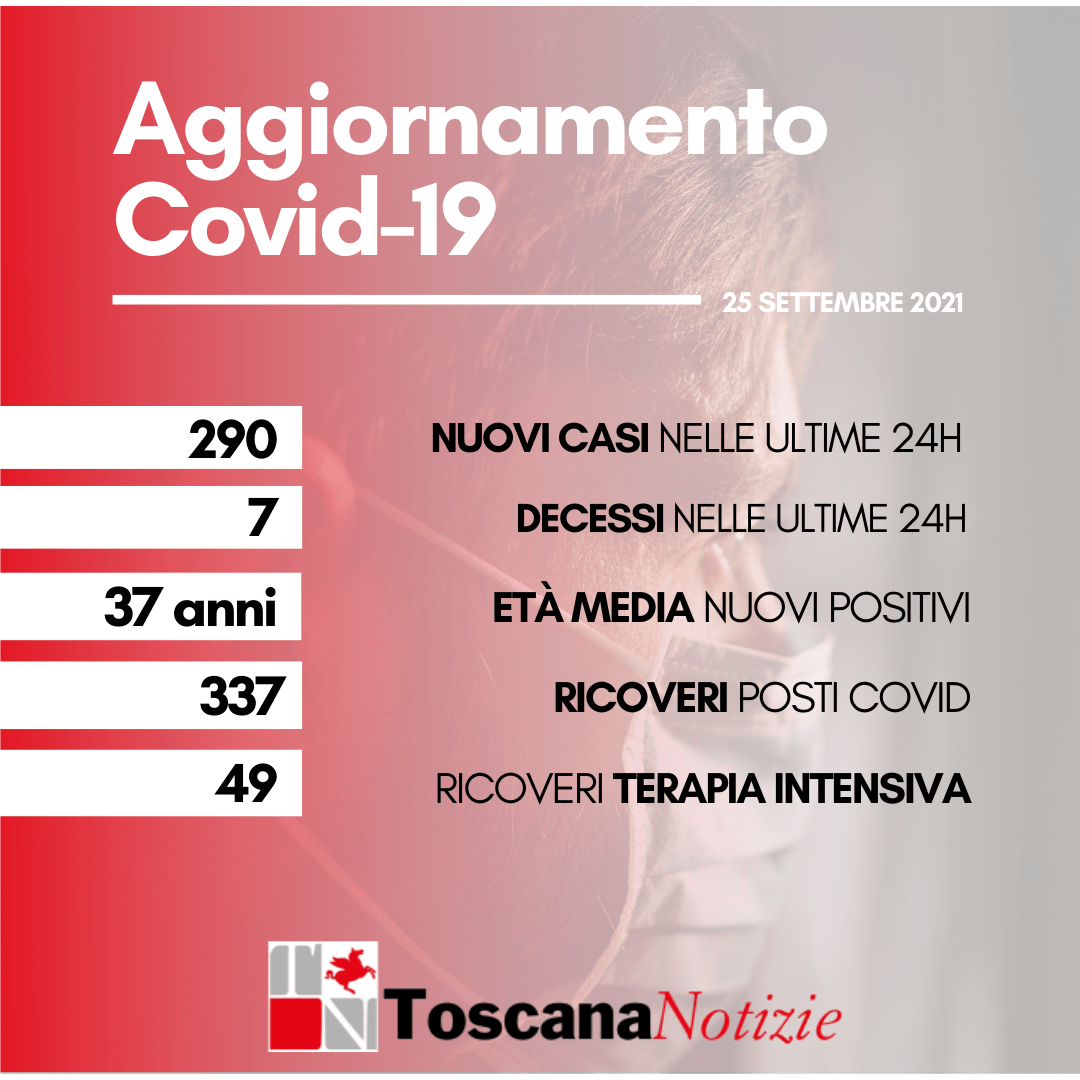 Coronavirus in Toscana: 7 morti (5 a Firenze,1 a Massa e Arezzo), oggi 25 settembre. E 290 contagi