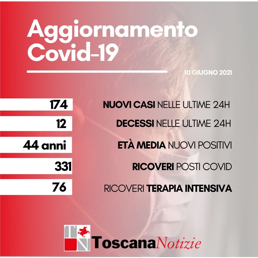 ono 12 i morti per coroinavirus, in Toscana, oggi 10 giugno 2021. Si tratta di 7 uomini e 5 donne con età media di 80 anni. Mentre sono 174 i nuovi contagiati (172 confermati...