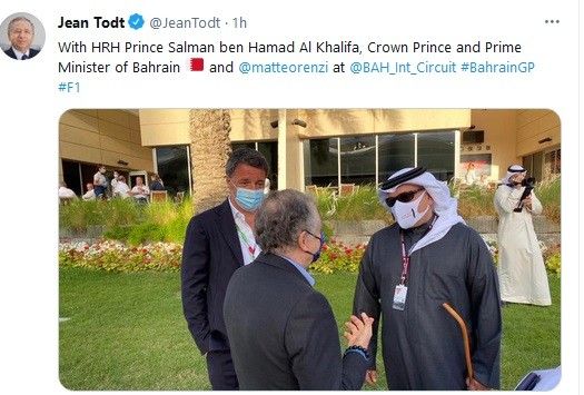 Il leader di Italia Viva è fotografato in compagnia del principe Salman ben Hamad Al Khalifa, primo ministro del Bahrein, e di Jean Todt, presidente della Federazione...