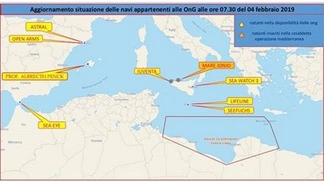 Lo scrive sui social il ministro dell''Interno Matteo Salvini, postando una cartina con la situazione aggiornata delle navi delle ong.
