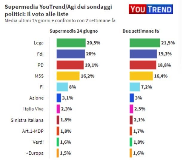Sondaggi YouTrend/Agi: Lega cala, ma sempre in testa, FdI supera il 20%, Pd al 19,1%