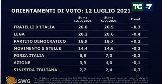 Sondaggi SWG per la7: Lega primo partito (21,3%), Pd e Fdi appaiati (19,5%), Renzi sempre all’1,8%