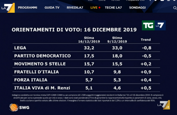 Ultimo sondaggio 2019: Lega al 32%, M5S al 17,7%. Pd al 18%