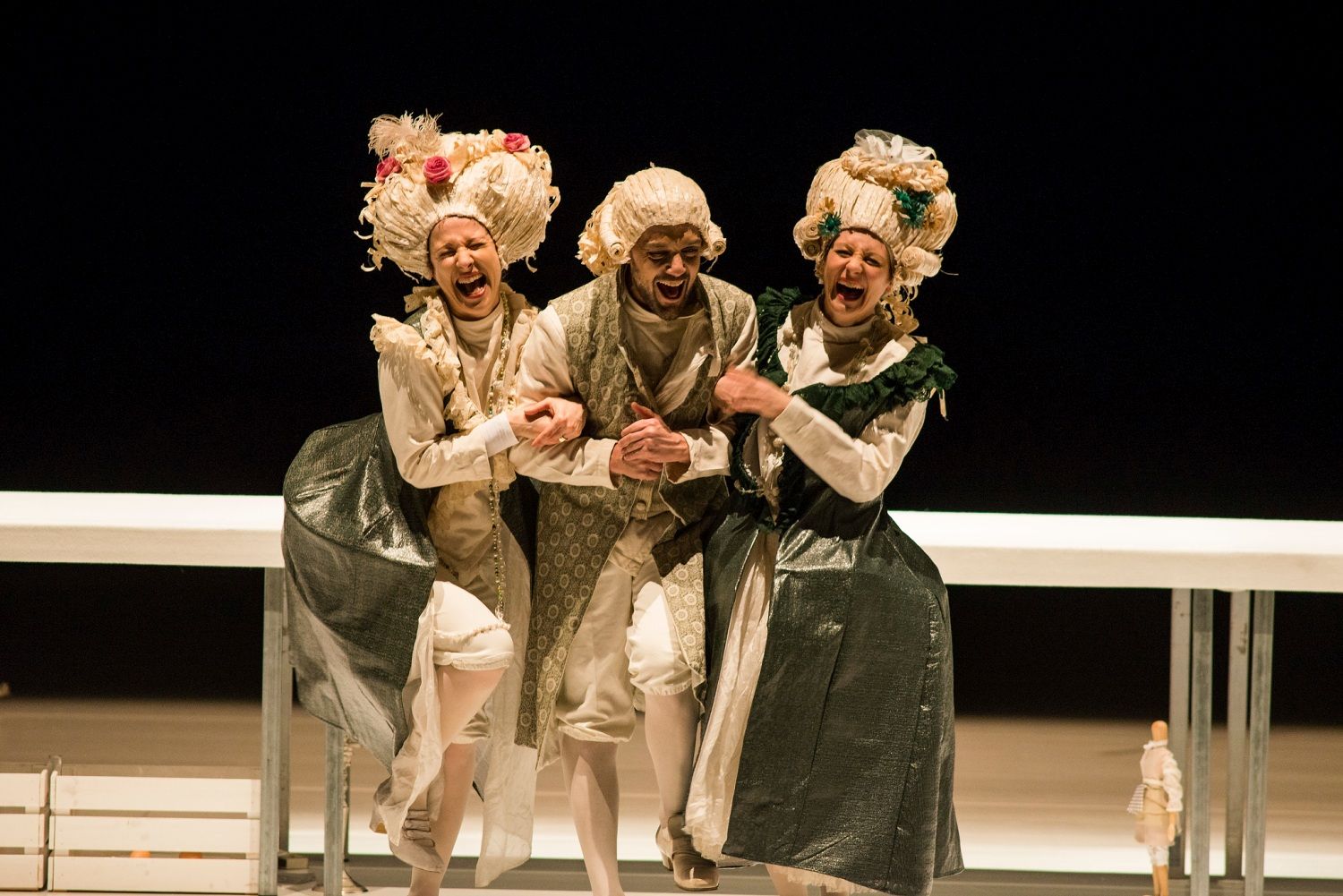 Sui toni di bianco della scena gli attori Caterina Carpio, Caterina Filograno, Tindaro Granata, Mariangela Granelli, Fabio Marchisio, muovono delle bamboline in legno e...