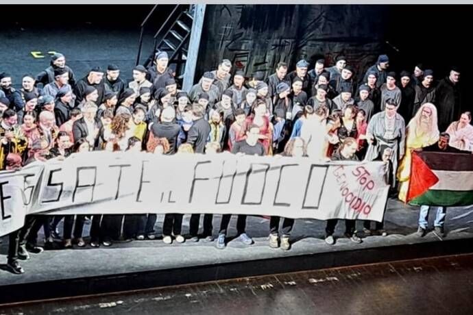 Uno striscione con la scritta "Cessate il fuoco Stop al genocidio" è stato esposto ieri sera, 27 aprile 2024, sul palco del Teatro Goldoni di Livorno, al termine dell'opera...