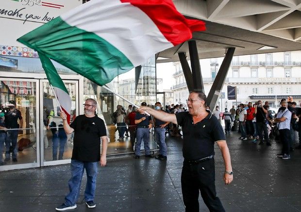 A Firenze, davanti alla stazione di Smn, 'blindata' dalle forze dell'ordine. solo un gruppetto di manifestanti, in gran parte senza mascherina, radunato davanti a uno degli...