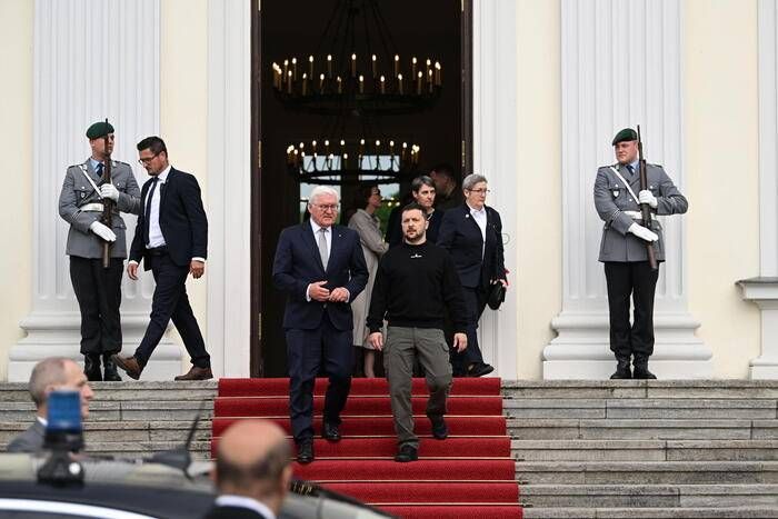 Zelensky è arrivato al castello di Bellevue, a Berlino, dove è stato accolto dal presidente Frank-Walter Steinmeier, per il saluto di benvenuto alla sua prima visita in Germania...