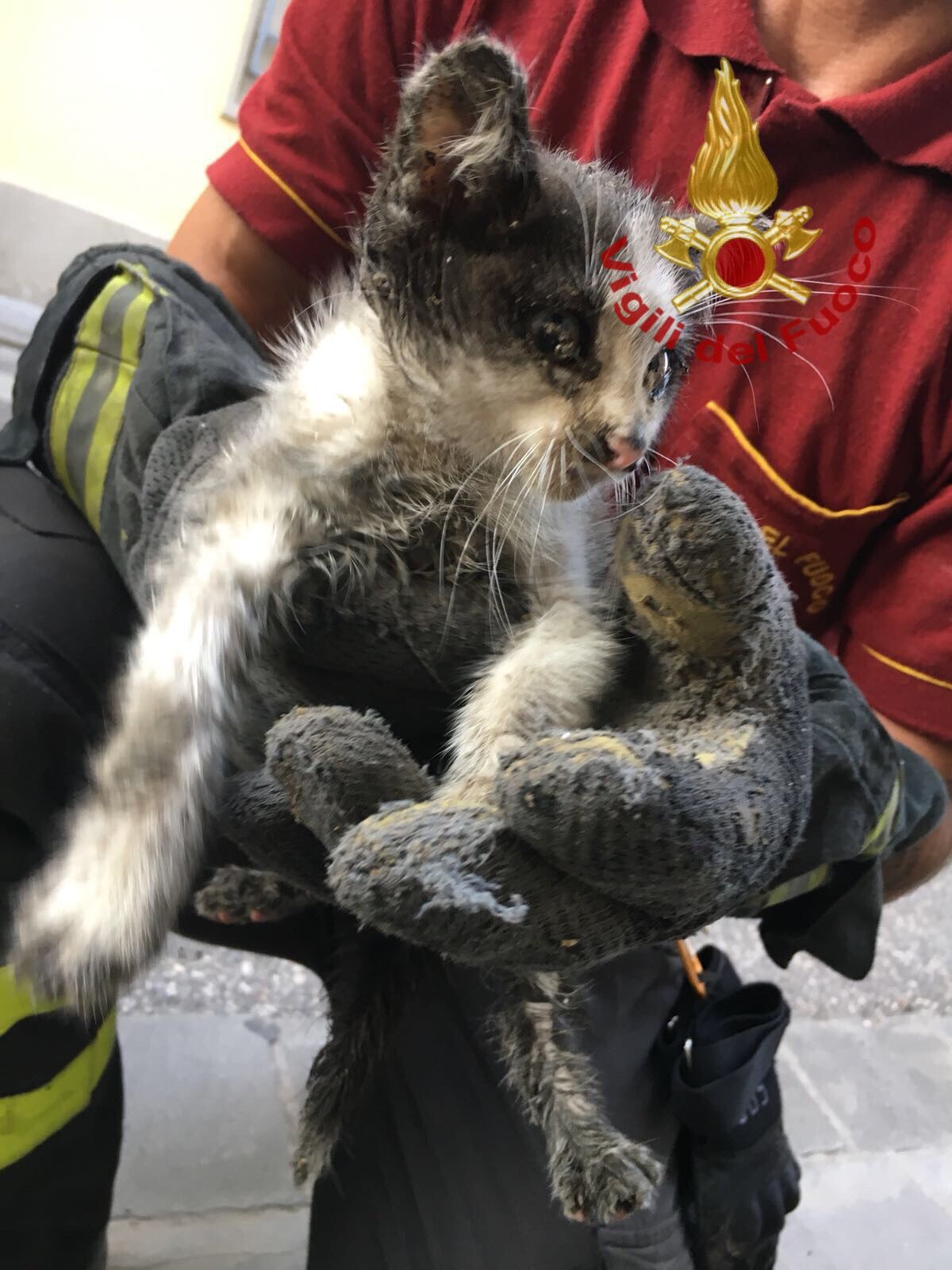 Era accidentalmente nel tubo di aspirazione di un bagno. La squadra dei pompieri, dopo non pochi sforzi, è riuscita a liberare il gatto, sporco e impaurito ma salvo