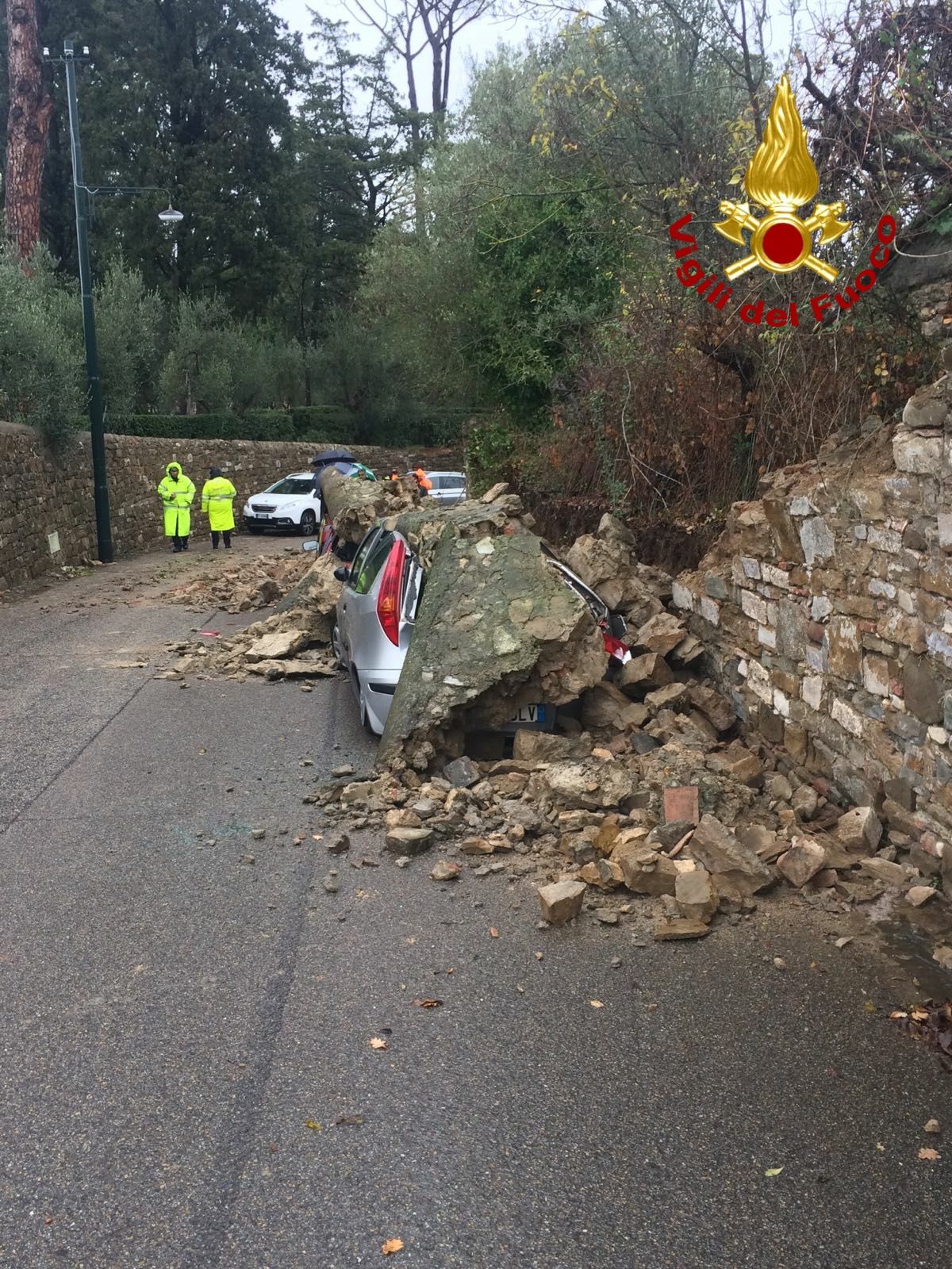 Firenze: auto schiacciate dal muro crollato in via di Santa Margherita a Montici. Colpa del vento