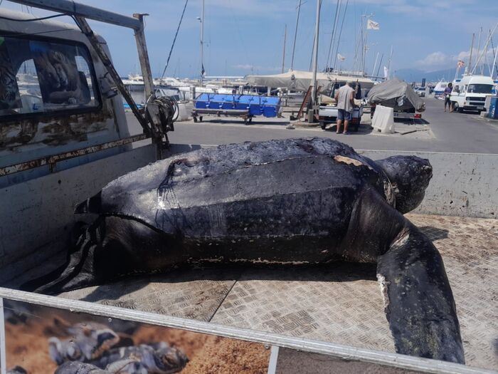 Un'enorme tartaruga liuto, specie 'Dermochelys coriacea', la più grande tartaruga di mare esistente e' stata trovata morta a due miglia di distanza dal faro del porto di Viareggio